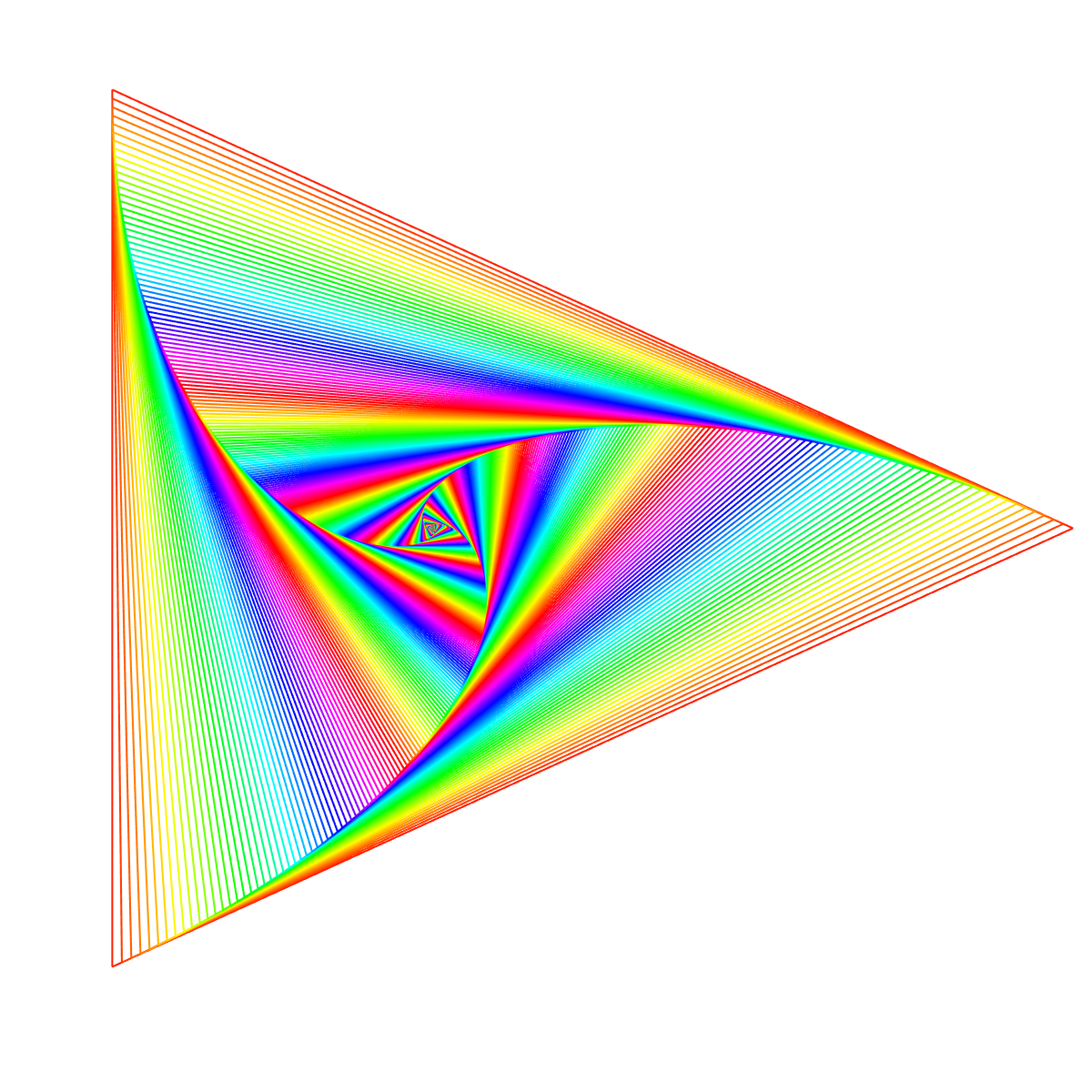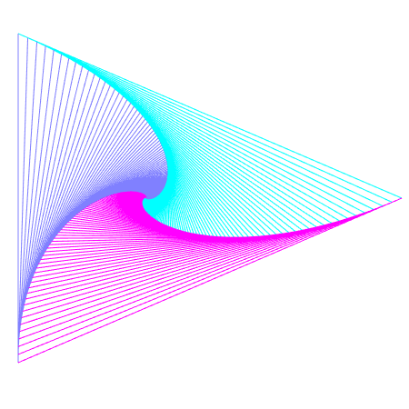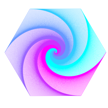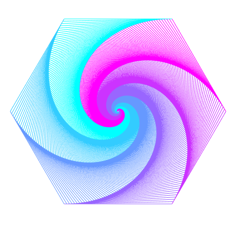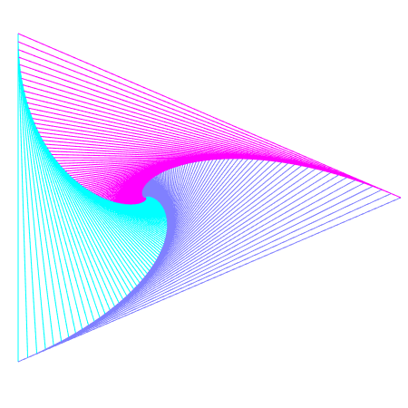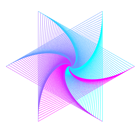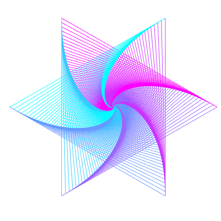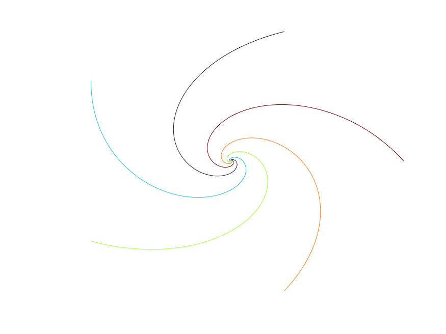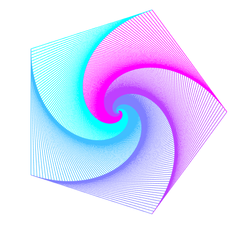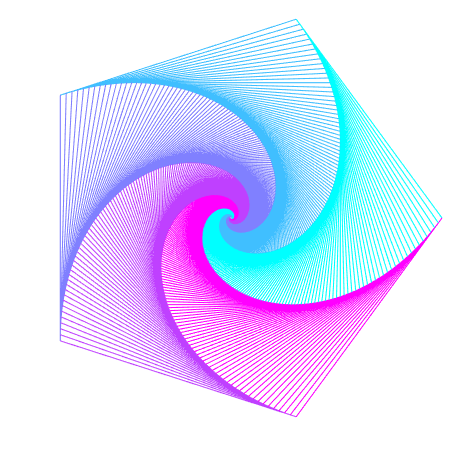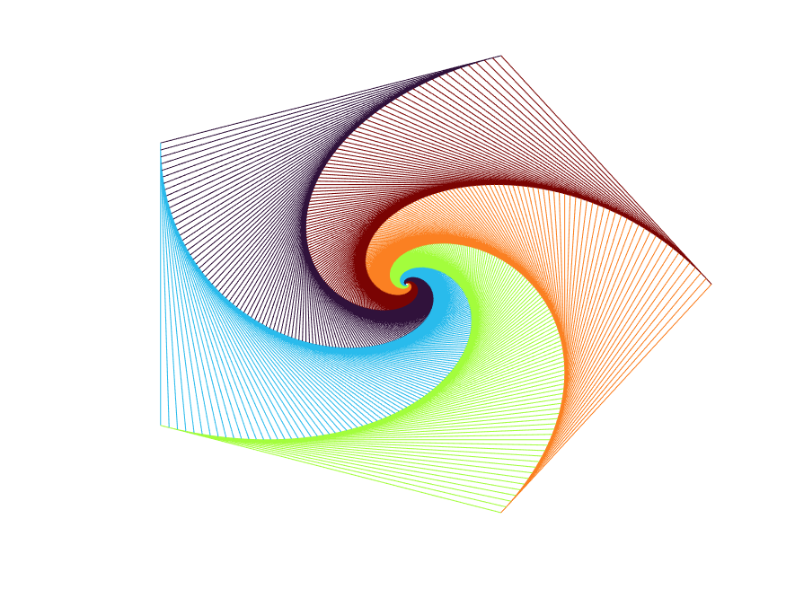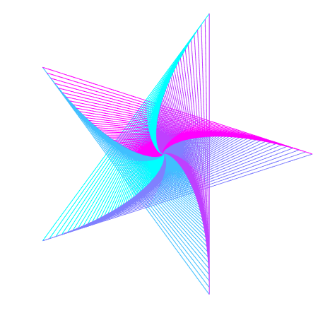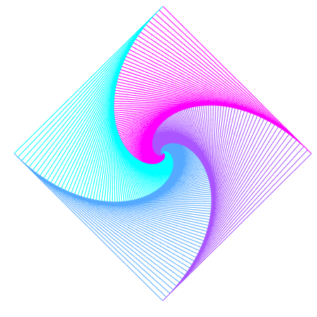 Some interesting diagrams can be made by considering “pursuit curves”. Imagine that there are some number of points representing pursuers that chase each other. At each time step, the pursuers will move towards the current position of their prey. One way to represent this data is to draw a curve representing the trajectory of each pursuer (style 1). Alternatively, at each time step we can draw a line between each pursuer and its prey (style 2). The code for these images can be found here.