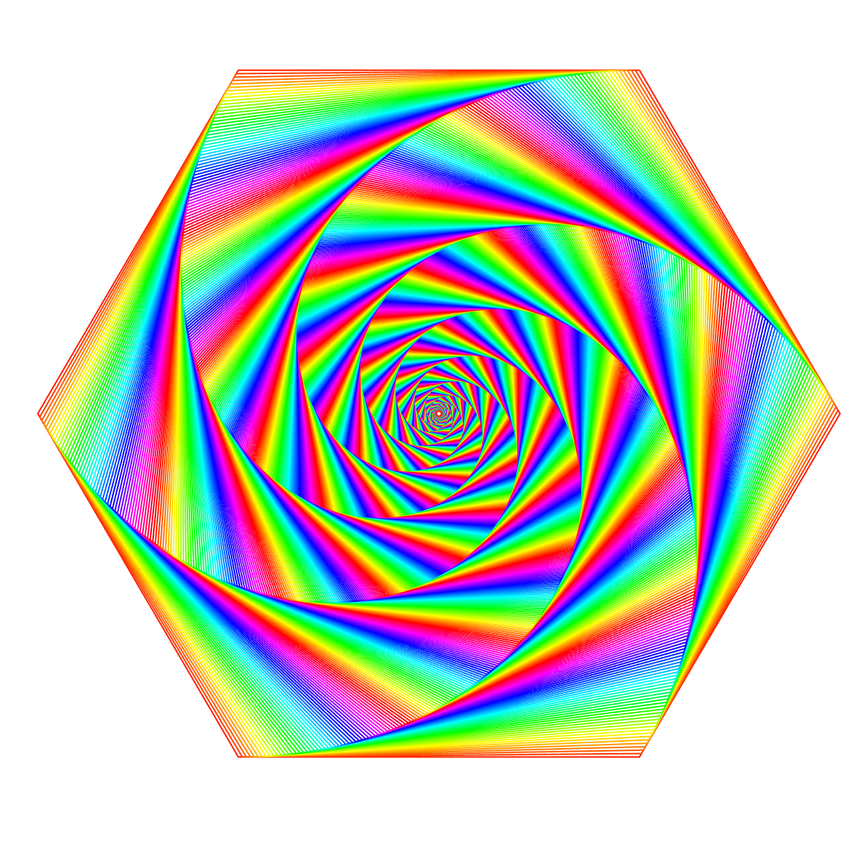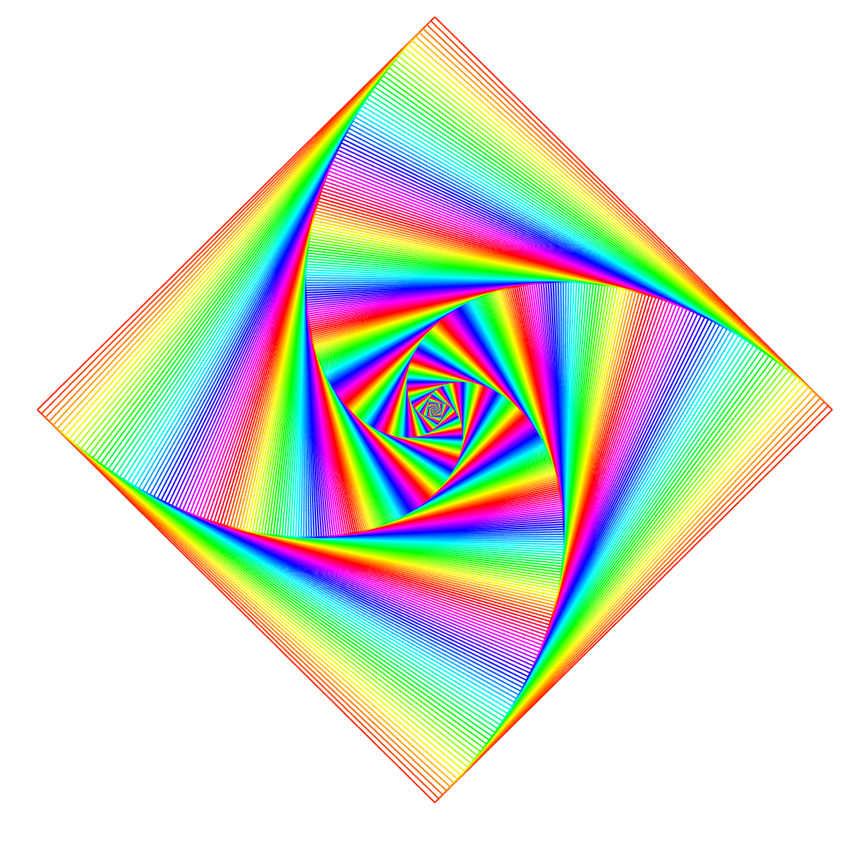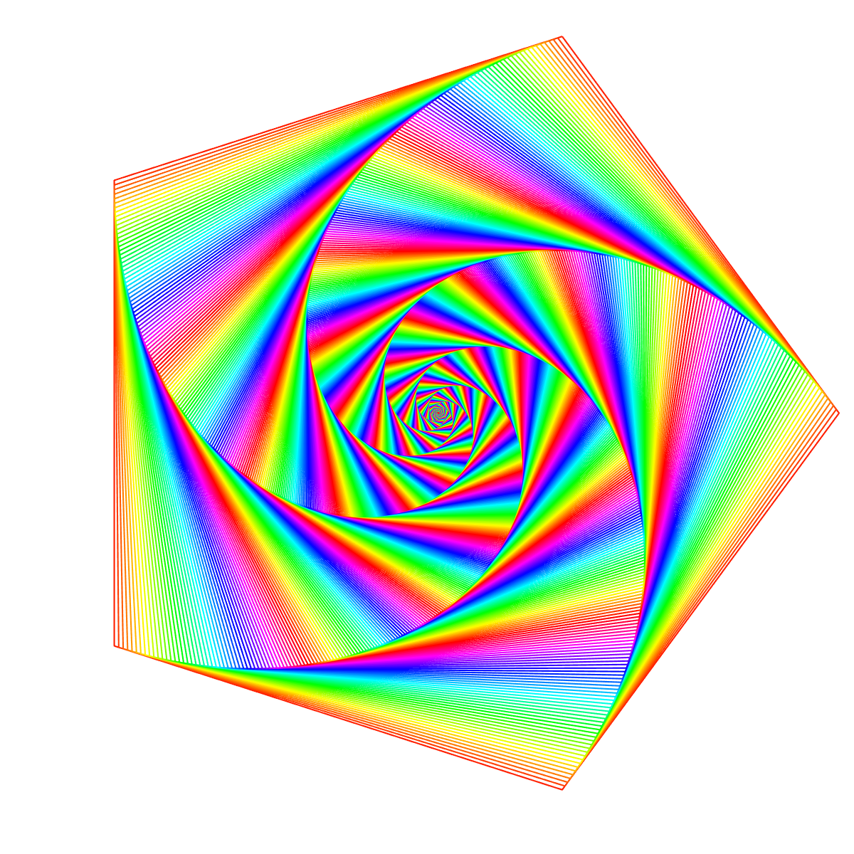 Some interesting diagrams can be made by considering “pursuit curves”. Imagine that there are some number of points representing pursuers that chase each other. At each time step, the pursuers will move towards the current position of their prey. One way to represent this data is to draw a curve representing the trajectory of each pursuer (style 1). Alternatively, at each time step we can draw a line between each pursuer and its prey (style 2). The code for these images can be found here.